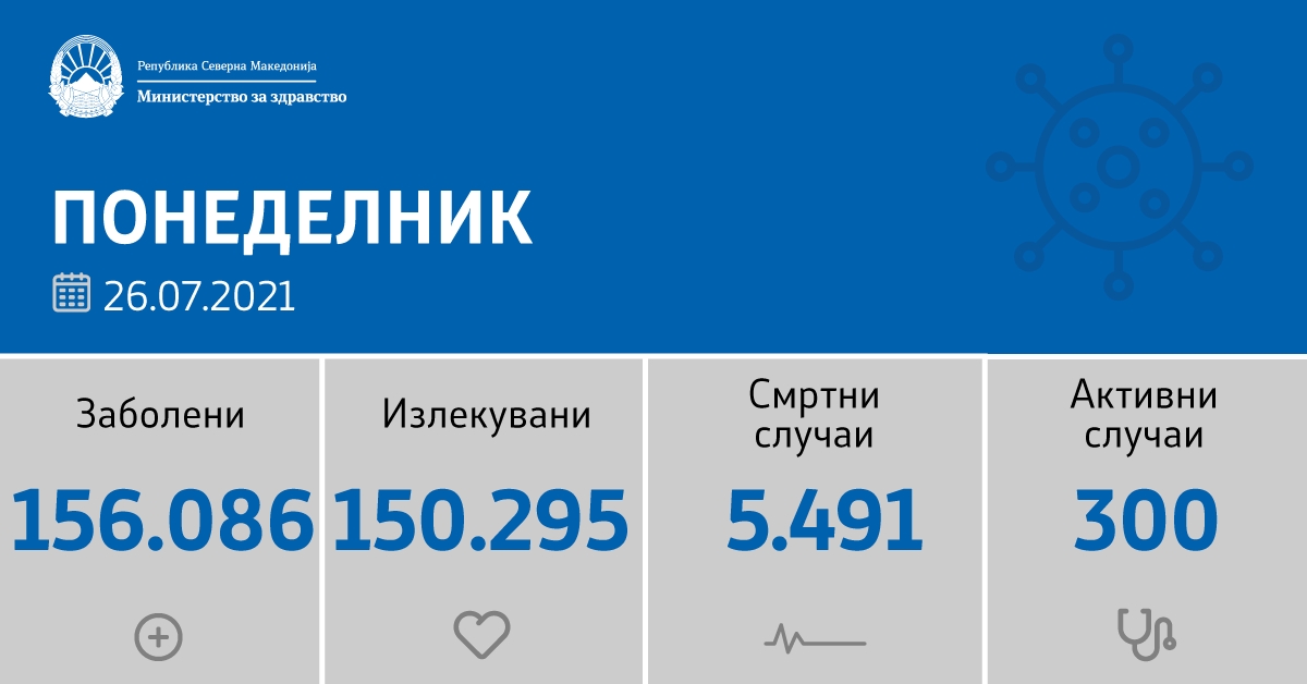 Вкупната бројка на КОВИД-дијагностицирани лица во нашата земја од почетокот на епидемијата изнесува 156.086 бројката на оздравени пациенти е 150.295, на починати е 5.491, а бројот на активни случаи изнесува 300.