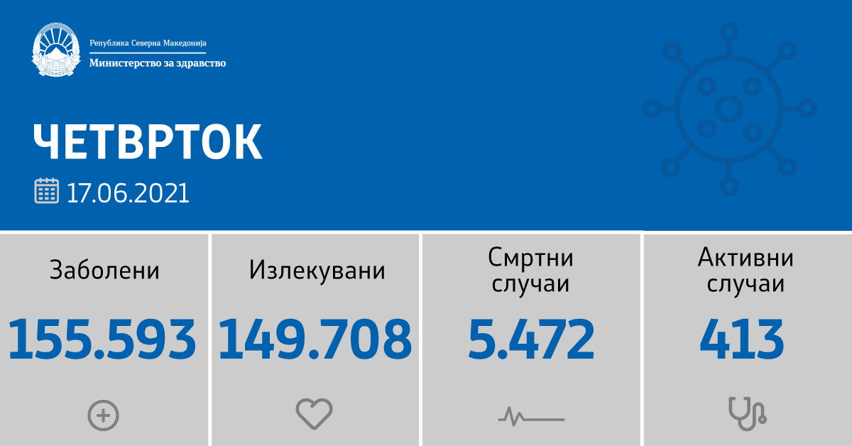 Вкупната бројка на КОВИД-дијагностицирани лица во нашата земја од почетокот на епидемијата изнесува 155.593, бројката на оздравени пациенти е 149.708, на починати е 5.472, а бројот на активни случаи изнесува 413.