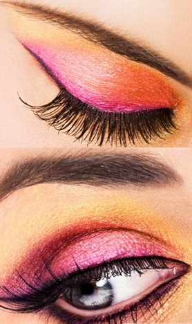 Направете си тробојна шминка со жолта, розова и виолетова сенка. Спојувањето на три бои ќе ви донесе интересен весел изглед кој ќе го разигра вашиот поглед.