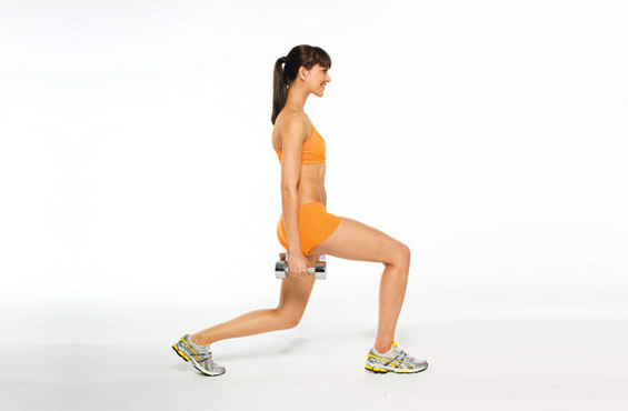 Направете голем чекор напред со десната нога и започнете да го спуштате горниот дел од телото надолу додека десното колено не оформи агол од 90°, а левото да биде веднаш над подот. Не поместувајќи ја левата нога, вратете ја десната во првобитната положба. Во текот на целата вежба грбот треба да ви биде исправен. Внимавајте, десното колено не треба да биде понапред од прстите на ногата.Потоа, направете голем чекор со левата нога и повторете ја вежбата. Направете 20 наизменични повторувања (десет со десната и 10 со левата нога).