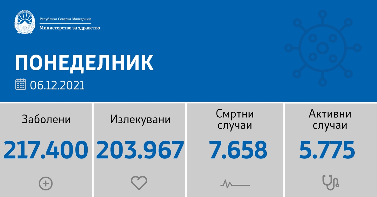 Вкупната бројка на КОВИД-дијагностицирани лица во нашата земја од почетокот на епидемијата изнесува 217.400, бројот на оздравени пациенти е 203.967, на починати е 7.658, а бројот на активни случаи изнесува 5.775.