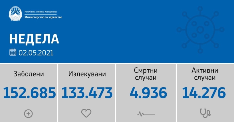 Вкупната бројка на Ковид-дијагностицирани лица во нашата земја од почетокот на епидемијата изнесува 152.685, бројката на оздравени пациенти е 133.473, на починати е 4.936, а бројот на активни случаи изнесува 14.276.