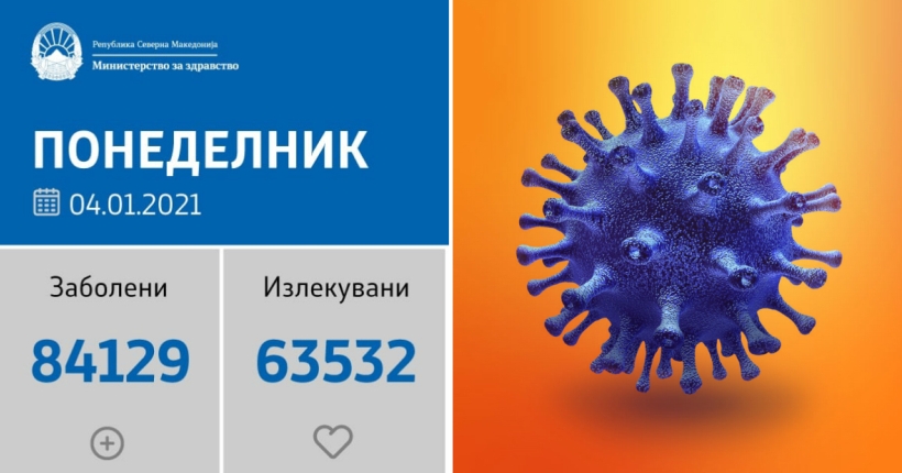 Вкупната бројка на ковид дијагностицирани во нашата земја од почетокот на епидемијата изнесува 84.129, бројката на оздравени пациенти е 63.532, на починати е 2.550, а бројот на активни случаи изнесува 18.047.
