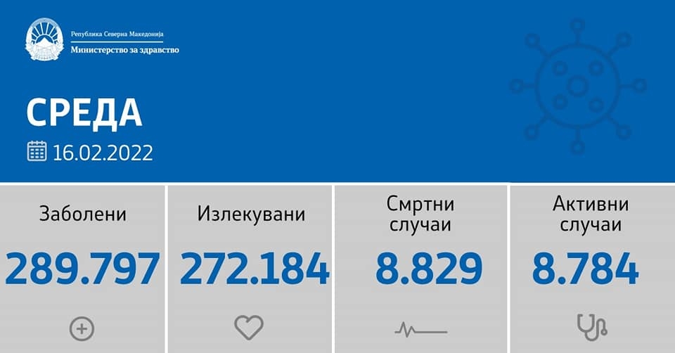 Вкупната бројка на КОВИД-дијагностицирани лица во нашата земја од почетокот на епидемијата изнесува 289.797, бројот на оздравени пациенти е 272.184, на починати е 8.829, а бројот на активни случаи изнесува 8.784.