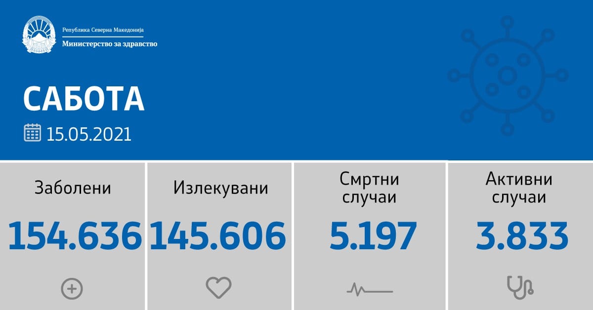 Вкупната бројка на Ковид-дијагностицирани лица во нашата земја од почетокот на епидемијата изнесува 154.636, бројката на оздравени пациенти е 145.606, на починати е 5.197, а бројот на активни случаи изнесува 3.833.