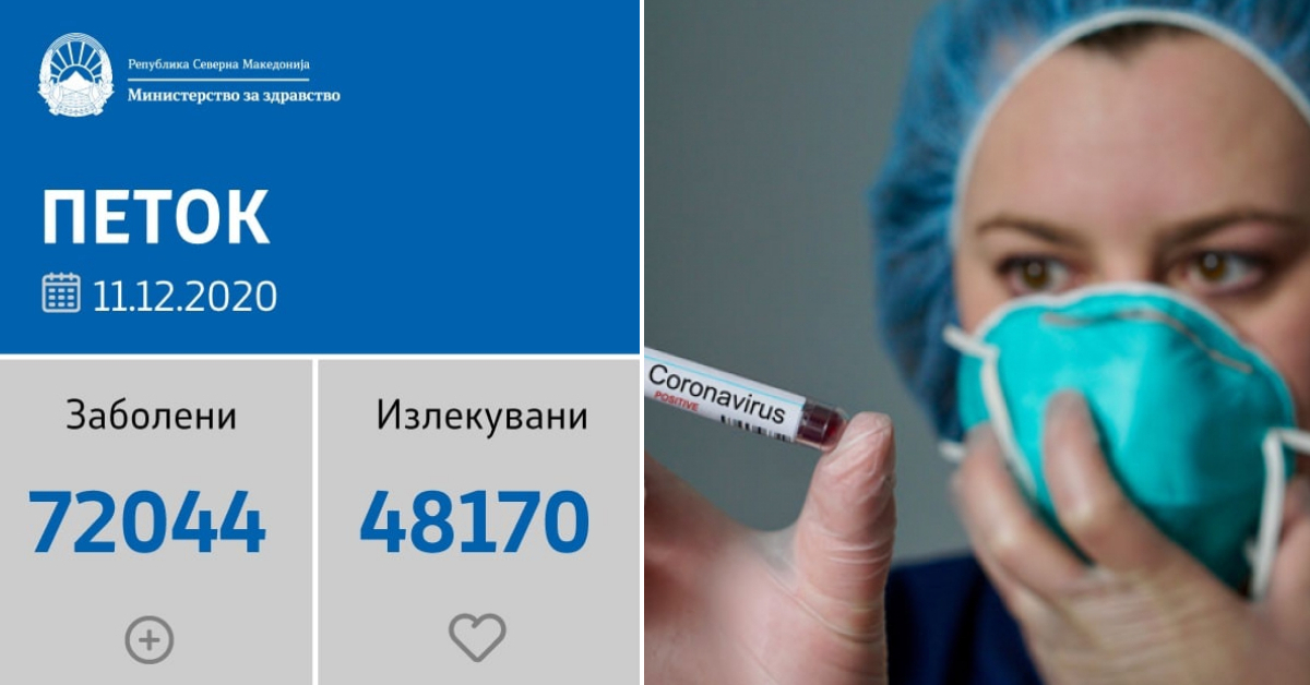 Вкупната бројка на ковид дијагностицирани во нашата земја од почетокот на епидемијата изнесува 72.044, бројката на оздравени пациенти е 48.170, на починати е 2.077, а бројот на активни случаи изнесува 21.797.