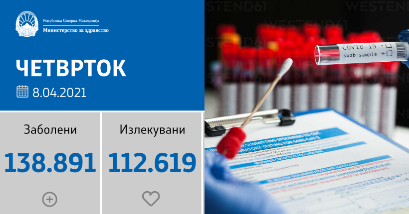 Вкупната бројка на КОВИД-дијагностицирани лица во нашата земја од почетокот на епидемијата изнесува 138.891, бројката на оздравени пациенти е 112.619, на починати е 4.108, а бројот на активни случаи изнесува 22.164.