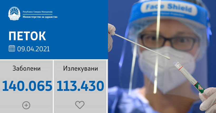 Вкупната бројка на КОВИД-дијагностицирани лица во нашата земја од почетокот на епидемијата изнесува 140.065, бројката на оздравени пациенти е 113.430, на починати е 4.150, а бројот на активни случаи изнесува 22.485.