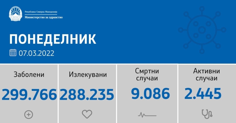 Вкупната бројка на КОВИД-дијагностицирани лица во нашата земја од почетокот на епидемијата изнесува 299.766, бројот на оздравени пациенти е 288.235, на починати е 9.086 а бројот на активни случаи изнесува 2.445.