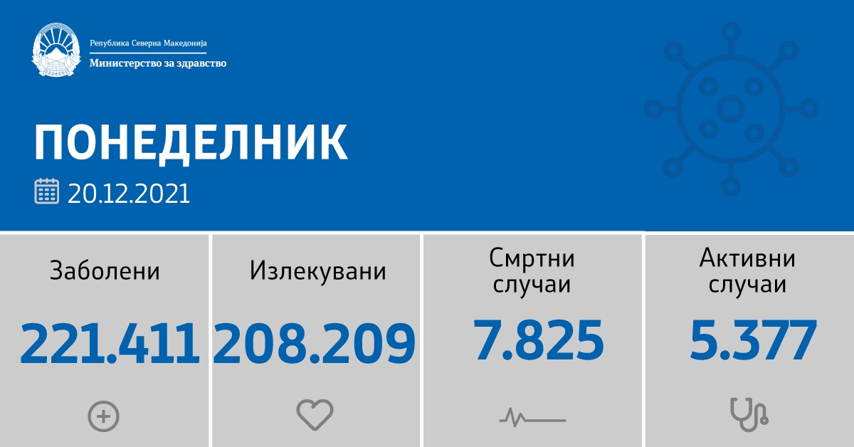 Вкупната бројка на КОВИД-дијагностицирани лица во нашата земја од почетокот на епидемијата изнесува 221.411, бројот на оздравени пациенти е 208.209, на починати е 7.825, а бројот на активни случаи изнесува 5.377.