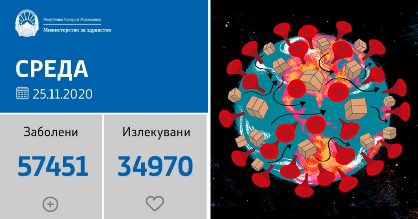 Вкупната бројка на ковид дијагностицирани во нашата земја од почетокот на епидемијата изнесува 57.451, бројката на оздравени пациенти е 34.970, на починати е 1.600, а бројот на активни случаи изнесува 20.881.