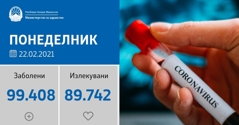 Вкупната бројка на КОВИД-дијагностицирани лица во нашата земја од почетокот на епидемијата изнесува 99.408, бројката на оздравени пациенти е 89.742, на починати е 3.076, а бројот на активни случаи изнесува 6.590.