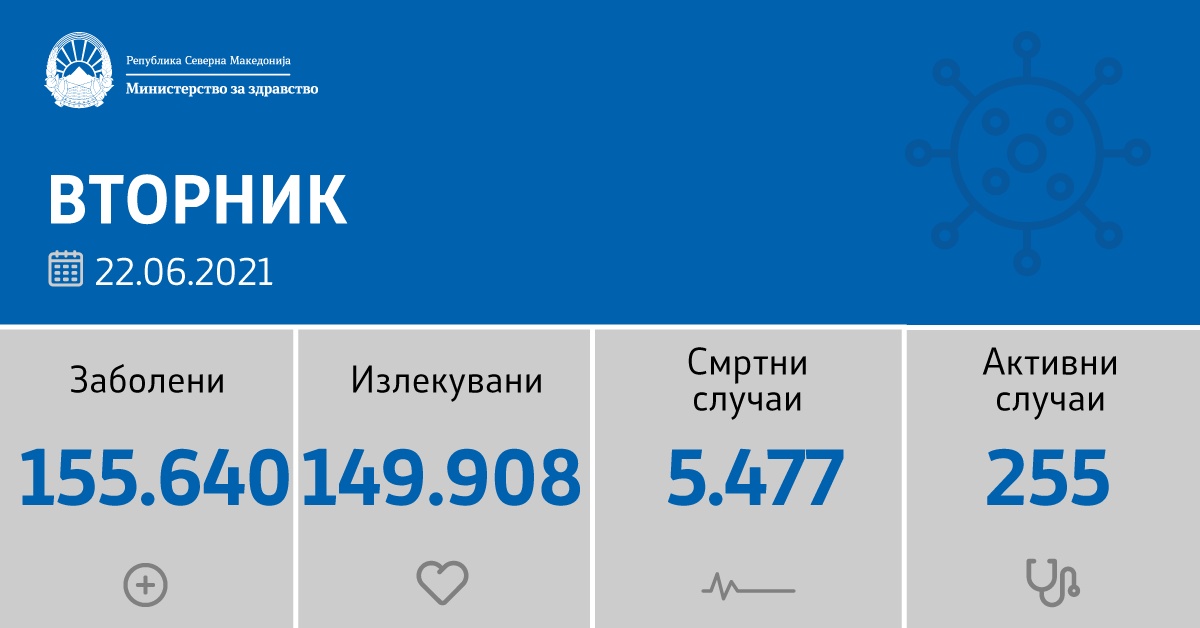 Вкупната бројка на КОВИД-дијагностицирани лица во нашата земја од почетокот на епидемијата изнесува 155.640, бројката на оздравени пациенти е 149.908, на починати е 5.477, а бројот на активни случаи изнесува 255