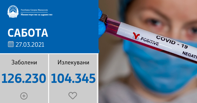 Вкупната бројка на КОВИД-дијагностицирани лица во нашата земја од почетокот на епидемијата изнесува 126.230, бројката на оздравени пациенти е 104.345, на починати е 3.642, а бројот на активни случаи изнесува 18.243.