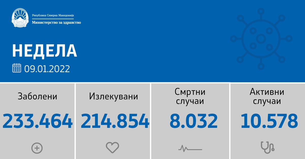 Вкупната бројка на КОВИД-дијагностицирани лица во нашата земја од почетокот на епидемијата изнесува 233.464, бројот на оздравени пациенти е 214.854, на починати е 8.032, а бројот на активни случаи изнесува 10.578.