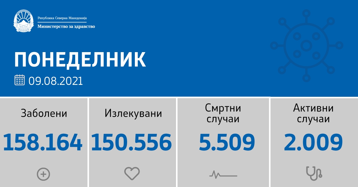 Вкупната бројка на КОВИД-дијагностицирани лица во нашата земја од почетокот на епидемијата изнесува 158.164 бројката на оздравени пациенти е 150.556, на починати е 5.509, а бројот на активни случаи изнесува 2.099.