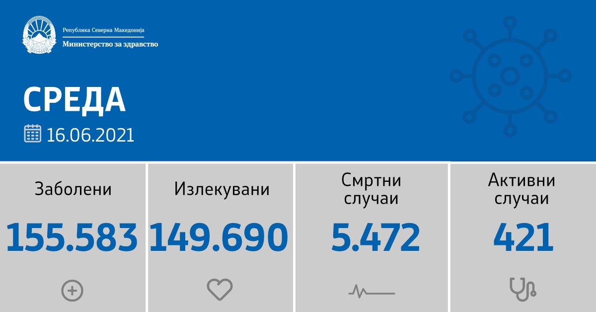 Вкупната бројка на КОВИД-дијагностицирани лица во нашата земја од почетокот на епидемијата изнесува 155.583, бројката на оздравени пациенти е 149.690, на починати е 5.472, а бројот на активни случаи изнесува 421.
