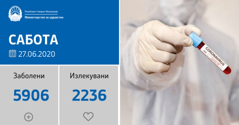 Вкупната бројка на дијагностицирани со КОВИД-19 во нашата земја од почетокот на епидемијата изнесува 5.906, бројката на оздравени пациенти е 2.236, на починати е 277, а во моментов бројот на активни случаи во земјата изнесува 3.393.