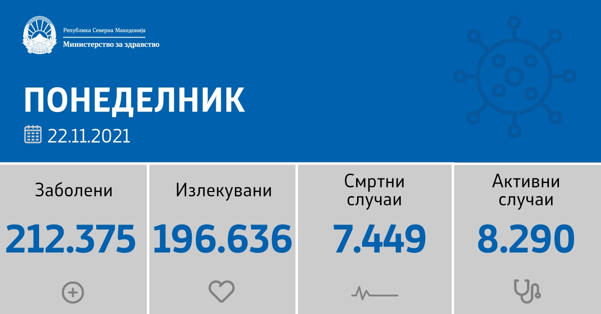Досега во земјата се направени вкупно 1.450.215 тестирања на Ковид-19. Вкупната бројка на КОВИД-дијагностицирани лица во нашата земја од почетокот на епидемијата изнесува 212.375, бројот на оздравени пациенти е 196.636, на починати е 7.449, а бројот на активни случаи изнесува 8.290.