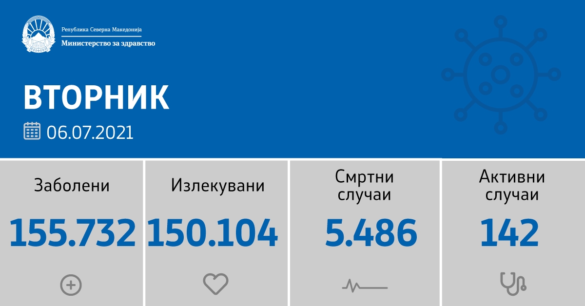 Вкупната бројка на КОВИД-дијагностицирани лица во нашата земја од почетокот на епидемијата изнесува 155.732, бројката на оздравени пациенти е 150.104, на починати е 5.486, а бројот на активни случаи изнесува 142.