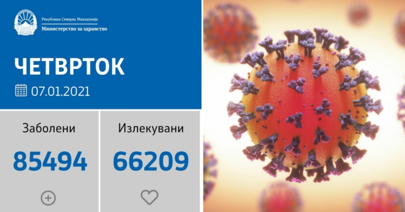 Вкупната бројка на ковид дијагностицирани во нашата земја од почетокот на епидемијата изнесува 85.494, бројката на оздравени пациенти е 66.209, на починати е 2.581, а бројот на активни случаи изнесува 16.704.