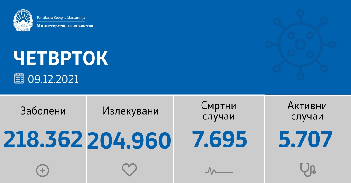Вкупната бројка на КОВИД-дијагностицирани лица во нашата земја од почетокот на епидемијата изнесува 218.362, бројот на оздравени пациенти е 204.960, на починати е 7.695, а бројот на активни случаи изнесува 5.707.