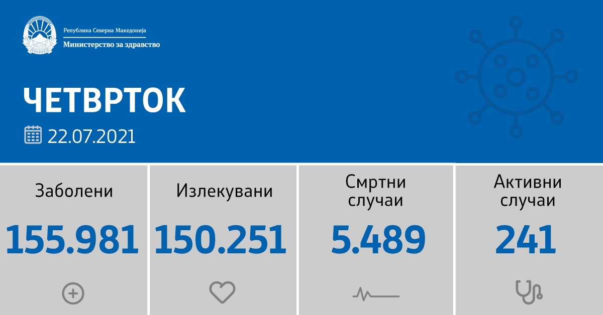 Вкупната бројка на КОВИД-дијагностицирани лица во нашата земја од почетокот на епидемијата изнесува 155.981, бројката на оздравени пациенти е 150.251, на починати е 5.489, а бројот на активни случаи изнесува 241.