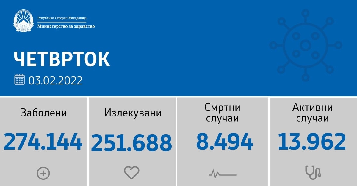 Вкупната бројка на КОВИД-дијагностицирани лица во нашата земја од почетокот на епидемијата изнесува 274.144, бројот на оздравени пациенти е 251.688, на починати е 8.494, а бројот на активни случаи изнесува 13.962.