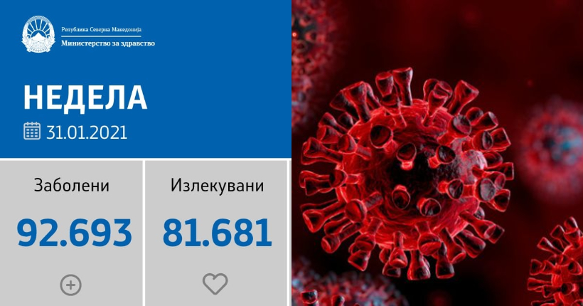 Вкупната бројка на КОВИД-дијагностицирани лица во нашата земја од почетокот на епидемијата изнесува 92.693, бројката на оздравени пациенти е 81.681, на починати е 2.855, а бројот на активни случаи изнесува 8.157.