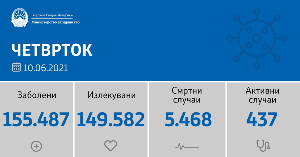 Вкупната бројка на КОВИД-дијагностицирани лица во нашата земја од почетокот на епидемијата изнесува 155.487, бројката на оздравени пациенти е 149.582, на починати е 5.468, а бројот на активни случаи изнесува 437.