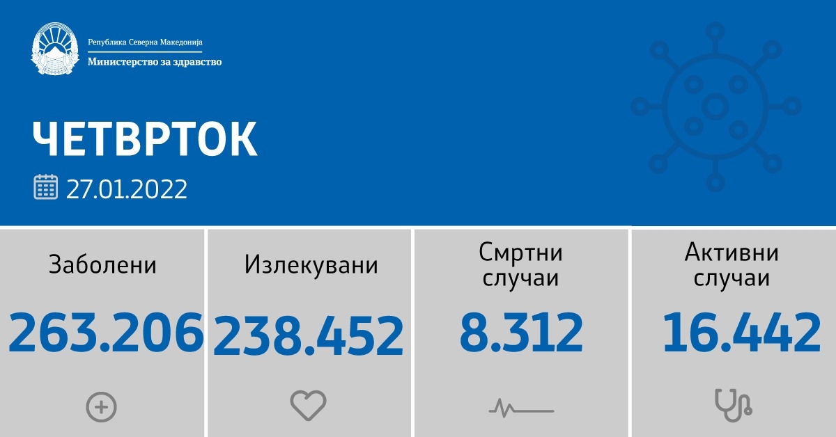 Вкупната бројка на КОВИД-дијагностицирани лица во нашата земја од почетокот на епидемијата изнесува 263.206, бројот на оздравени пациенти е 238.452, на починати е 8.312, а бројот на активни случаи изнесува 16.442.