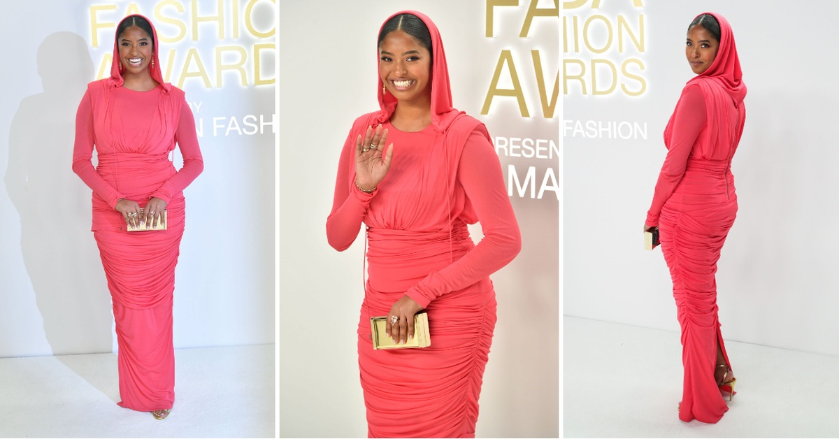 19-годишната ќерка на Коби и Ванеса Брајант зачекори на церемонијата во долг розов фустан со качулка од Том Форд, кој го надополни со златни модни детали.