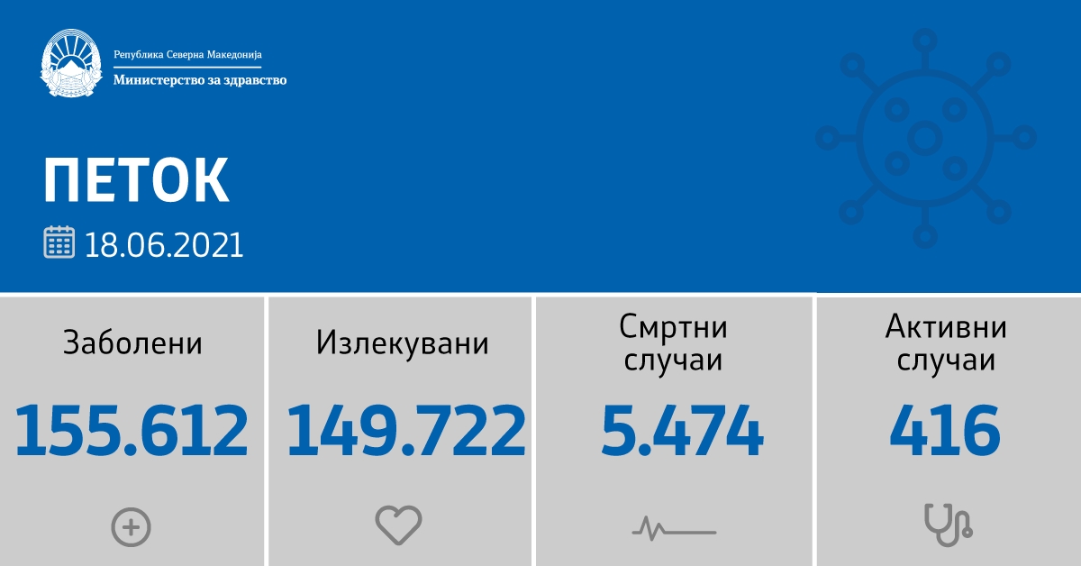 Вкупната бројка на КОВИД-дијагностицирани лица во нашата земја од почетокот на епидемијата изнесува 155.612, бројката на оздравени пациенти е 149.722, на починати е 5.474, а бројот на активни случаи изнесува 416.