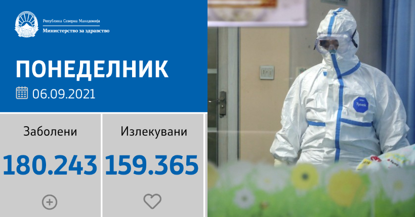 Вкупната бројка на КОВИД-дијагностицирани лица во нашата земја од почетокот на епидемијата изнесува 180.243, бројката на оздравени пациенти е 159.365, на починати е 6.097, а бројот на активни случаи изнесува 14.781.