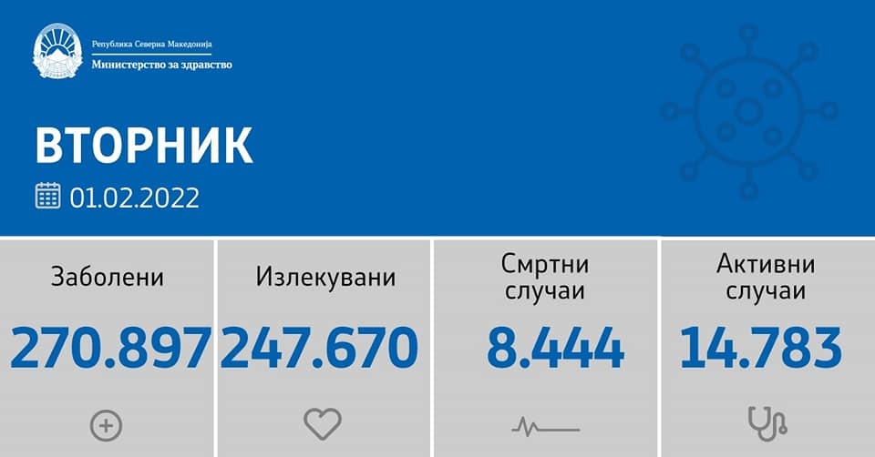 Вкупната бројка на КОВИД-дијагностицирани лица во нашата земја од почетокот на епидемијата изнесува 270.897, бројот на оздравени пациенти е 247.670, на починати е 8.444, а бројот на активни случаи изнесува 14.783.