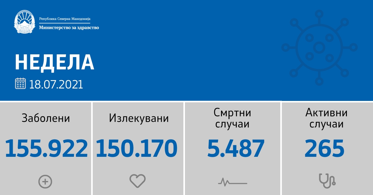 Вкупната бројка на КОВИД-дијагностицирани лица во нашата земја од почетокот на епидемијата изнесува 155.922, бројката на оздравени пациенти е 150.170, на починати е 5.487, а бројот на активни случаи изнесува 265.