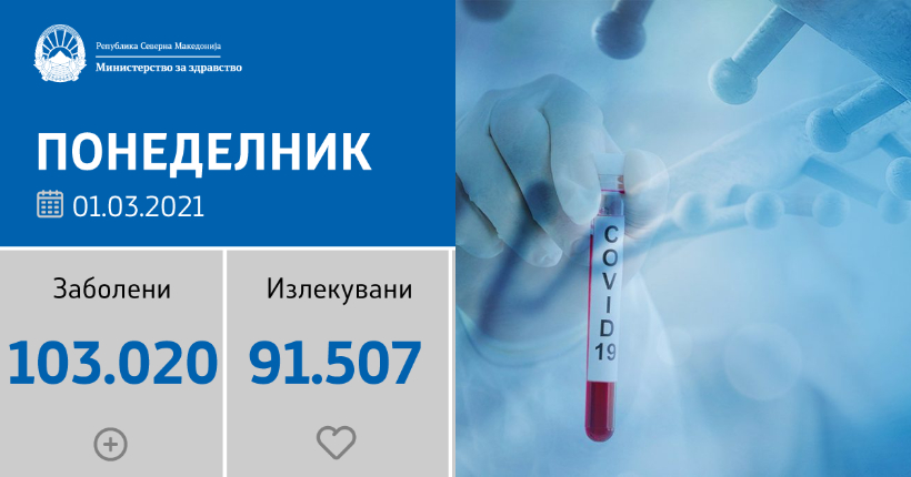 Вкупната бројка на КОВИД-дијагностицирани лица во нашата земја од почетокот на епидемијата изнесува 103.020, бројката на оздравени пациенти е 91.507, на починати е 3.144, а бројот на активни случаи изнесува 8.369.