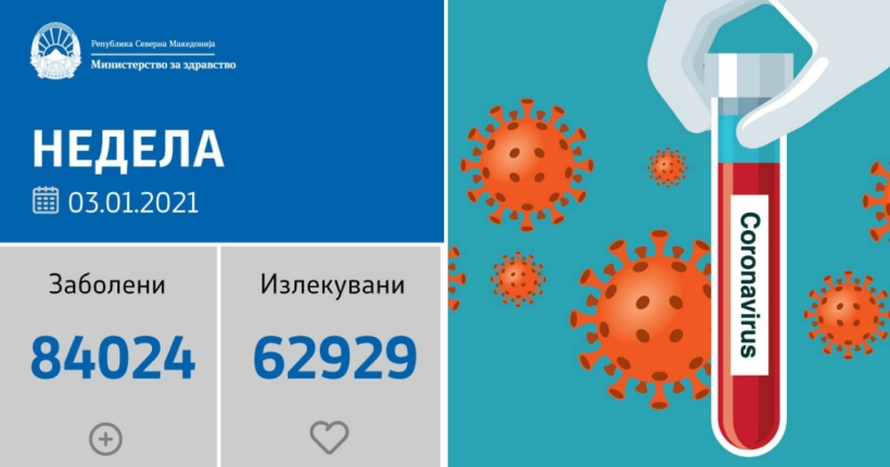 Вкупната бројка на ковид дијагностицирани во нашата земја од почетокот на епидемијата изнесува 84.024, бројката на оздравени пациенти е 62.929, на починати е 2.530, а бројот на активни случаи изнесува 18.565.