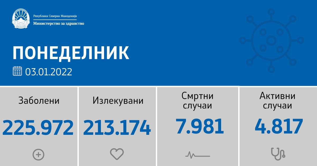 Вкупната бројка на КОВИД-дијагностицирани лица во нашата земја од почетокот на епидемијата изнесува 225.972, бројот на оздравени пациенти е 213.174, на починати е 7.981, а бројот на активни случаи изнесува 4.817.