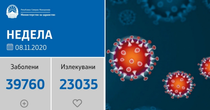 Вкупната бројка на ковид дијагностицирани во нашата земја од почетокот на епидемијата изнесува 39.760, бројката на оздравени пациенти е 23.035, на починати е 1.136, а бројот на активни случаи изнесува 15.589.