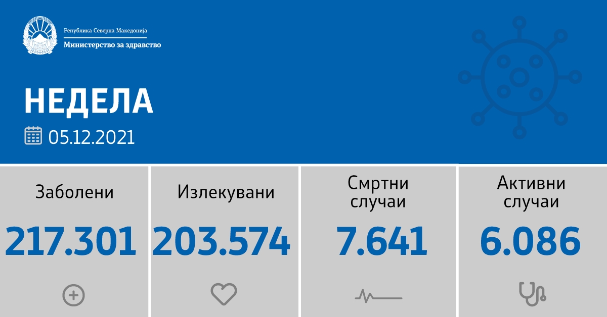 Вкупната бројка на КОВИД-дијагностицирани лица во нашата земја од почетокот на епидемијата изнесува 217.301, бројот на оздравени пациенти е 203.574, на починати е 7.641, а бројот на активни случаи изнесува 6.086.