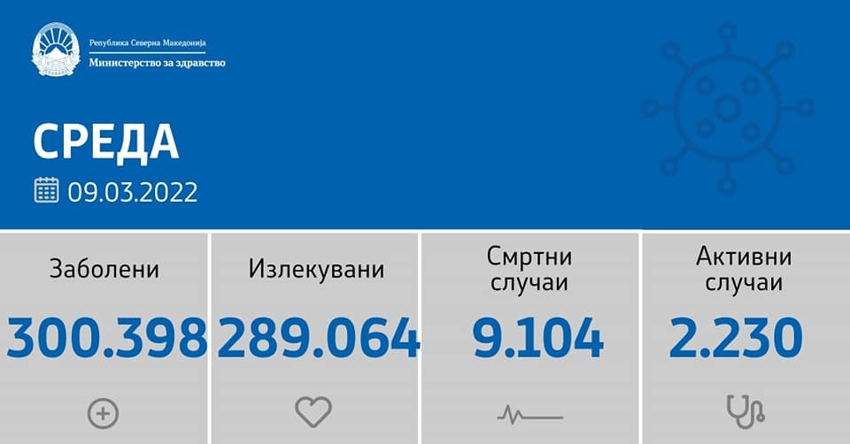 Вкупната бројка на КОВИД дијагностицирани лица во нашата земја од почетокот на епидемијата изнесува 300.398, бројот на оздравени пациенти е 289.064, на починати е 9.104 а бројот на активни случаи изнесува 2.230.