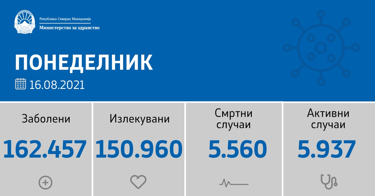 Вкупната бројка на КОВИД-дијагностицирани лица во нашата земја од почетокот на епидемијата изнесува 162.457 бројката на оздравени пациенти е 150.960, на починати е 5.560, а бројот на активни случаи изнесува 5.937.