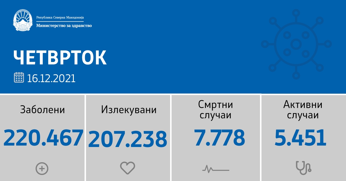 Вкупната бројка на КОВИД-дијагностицирани лица во нашата земја од почетокот на епидемијата изнесува 220.467, бројот на оздравени пациенти е 207.238, на починати е 7.778, а бројот на активни случаи изнесува 5.451.