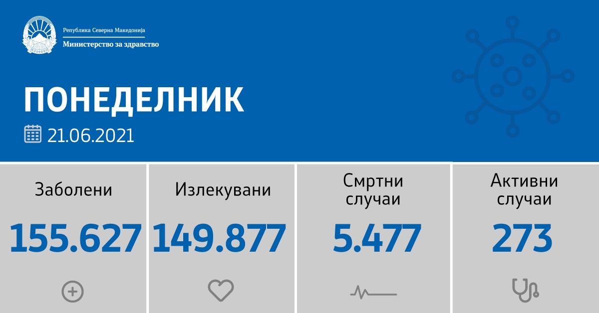 Вкупната бројка на КОВИД-дијагностицирани лица во нашата земја од почетокот на епидемијата изнесува 155.627, бројката на оздравени пациенти е 149.877, на починати е 5.477, а бројот на активни случаи изнесува 273.