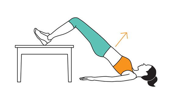 Инструкции: Легнете на подот на грб и свиткајте ги колената под агол од 90°. Поставете ги петиците на ниска масичка, стабилен стол или кревет. Прстите на нозете треба да се насочени кон таванот, а рацете да се испружени покрај телото. Стегнете ги мускулите на задникот и подигнете ги колковите за да направите „мост“ (како на сликата). Вратете се во првата положба.