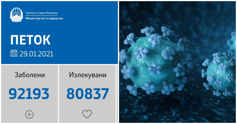 Вкупната бројка на ковид дијагностицирани во нашата земја од почетокот на епидемијата изнесува 92.193, бројката на оздравени пациенти е 80.837, на починати е 2.841, а бројот на активни случаи изнесува 8.515.