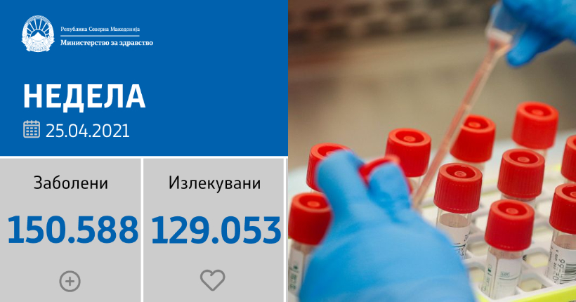 Вкупната бројка на Ковид-дијагностицирани лица во нашата земја од почетокот на епидемијата изнесува 150.588, бројката на оздравени пациенти е 129.053, на починати е 4.677, а бројот на активни случаи изнесува 16.858.