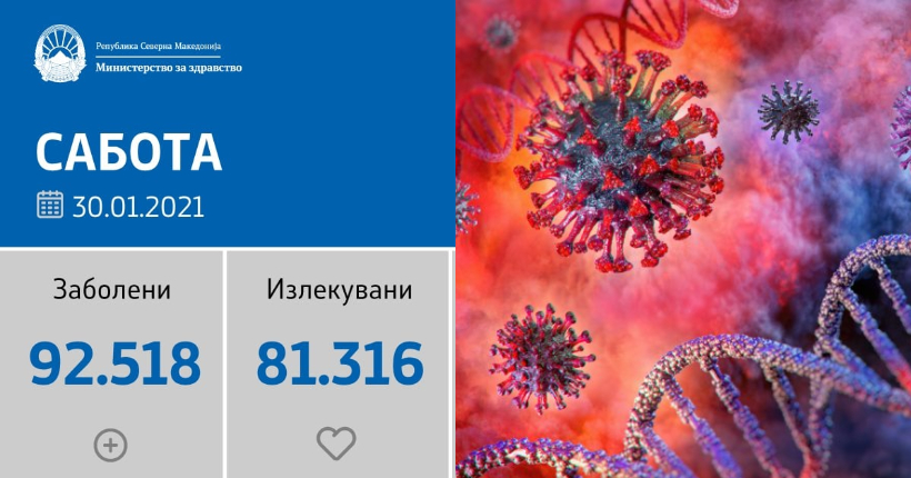 Вкупната бројка на КОВИД-дијагностицирани лица во нашата земја од почетокот на епидемијата изнесува 92.518, бројката на оздравени пациенти е 81.316, на починати е 2.848, а бројот на активни случаи изнесува 8.354.