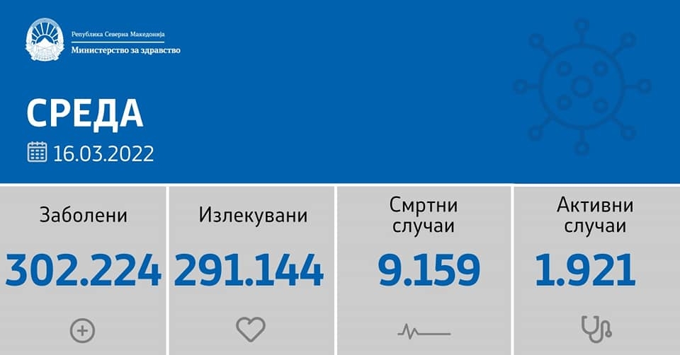 Вкупната бројка на КОВИД-дијагностицирани лица во нашата земја од почетокот на епидемијата изнесува 302.224, бројот на оздравени пациенти е 291.144, на починати е 9.159, а бројот на активни случаи изнесува 1.921.